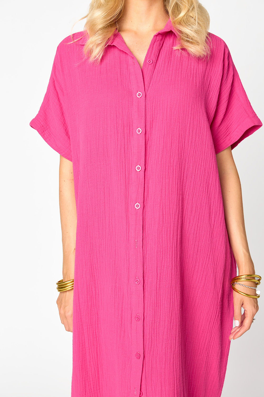 Look comfy and cute at the beach in this Carmen Cover Up Maxi Dress! Crafted in lightweight gauze, it features short sleeve and buttons running all down the front.