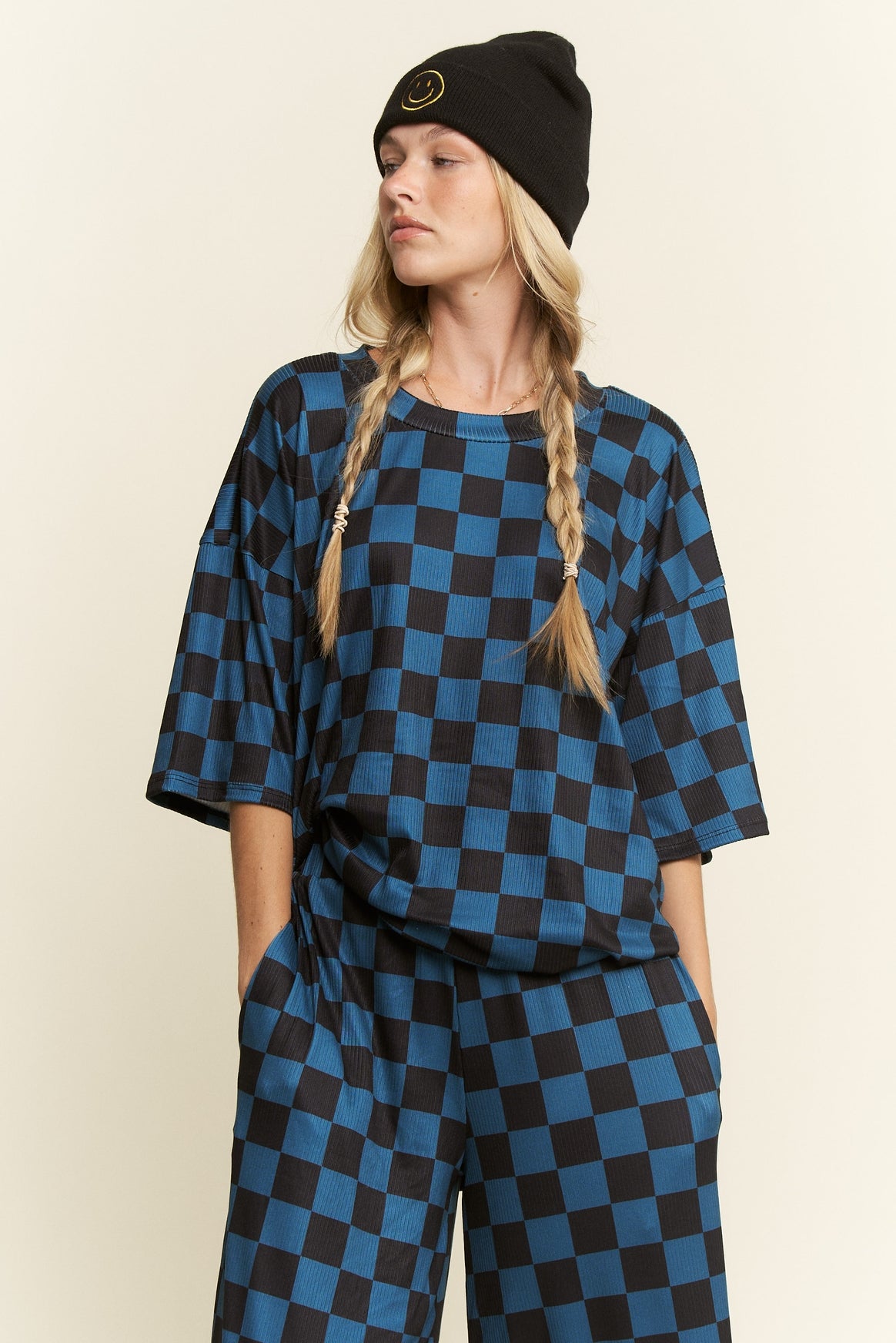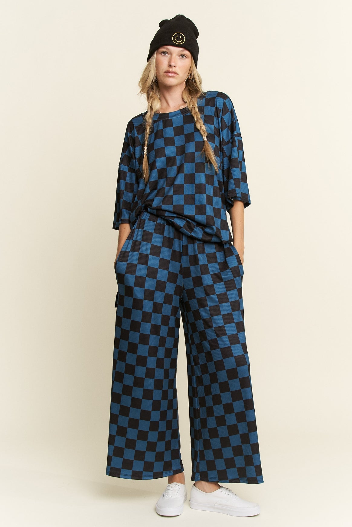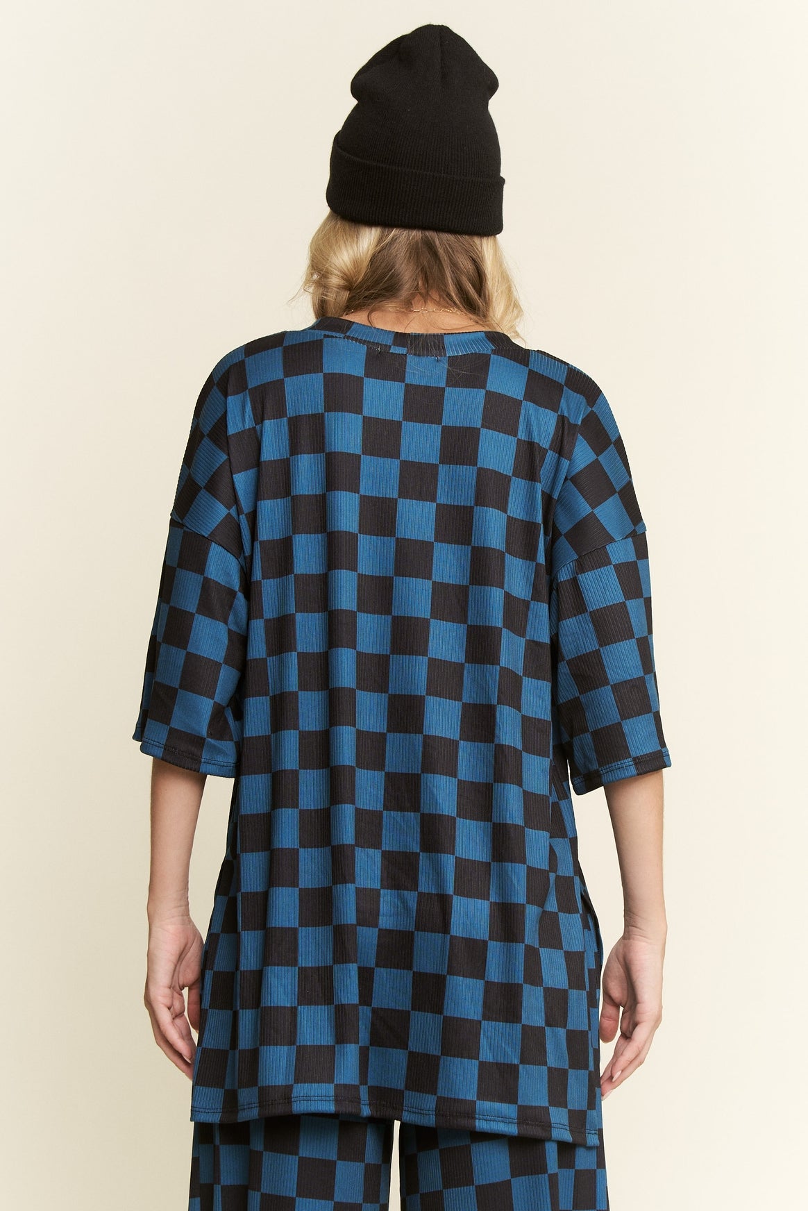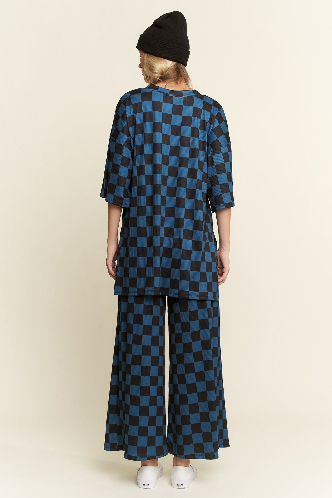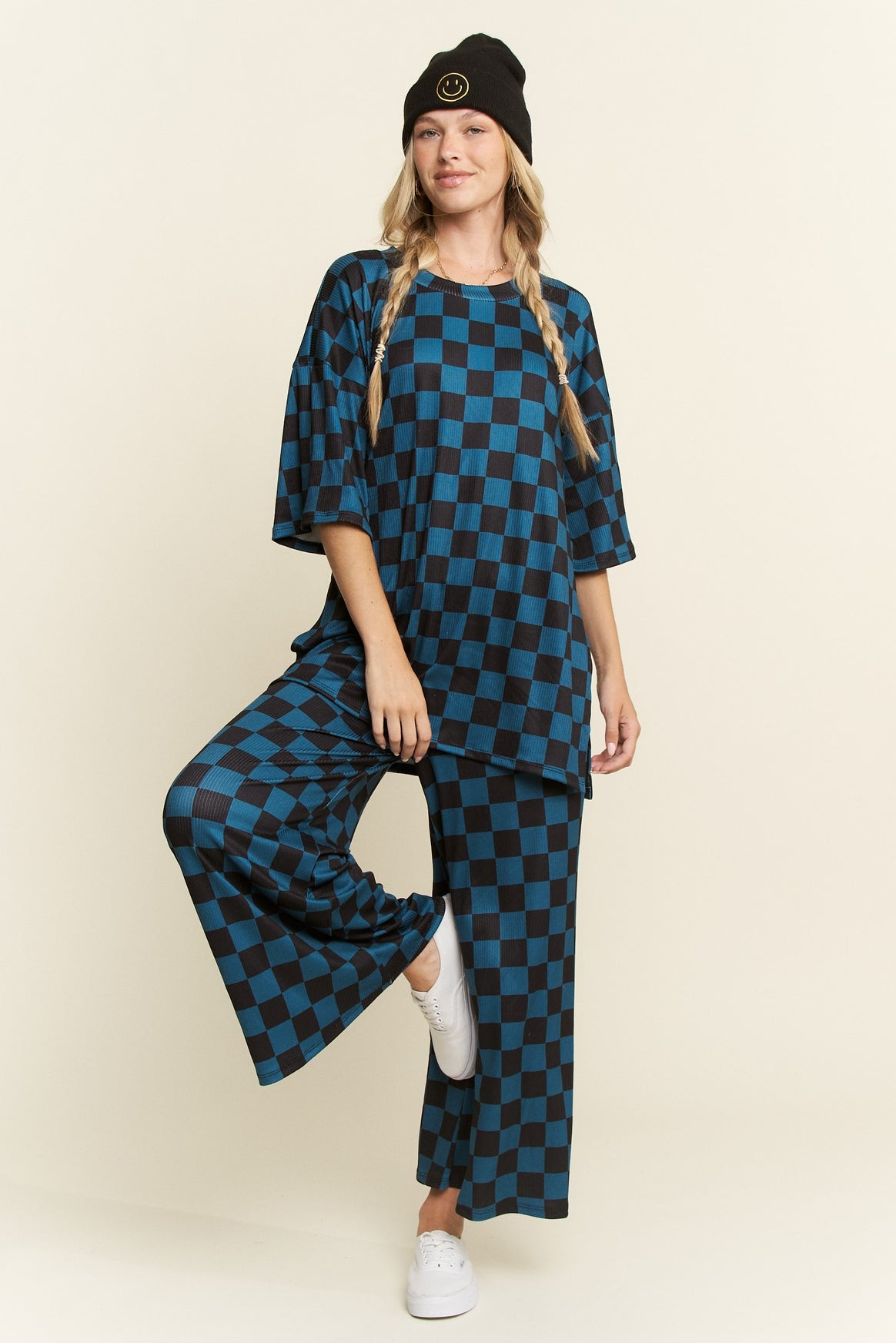 Turn heads in bold, laid-back style with our Checkmate Two-Piece Set, a must-have for trendsetters who love to mix comfort with streetwear edge. Designed in a striking teal and black checkerboard print, this matching oversized top and wide-leg pant set is your go-to look for everything from coffee runs to casual nights out.