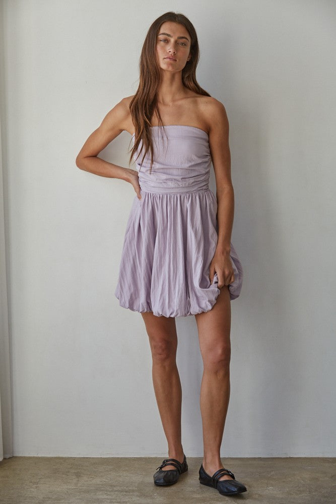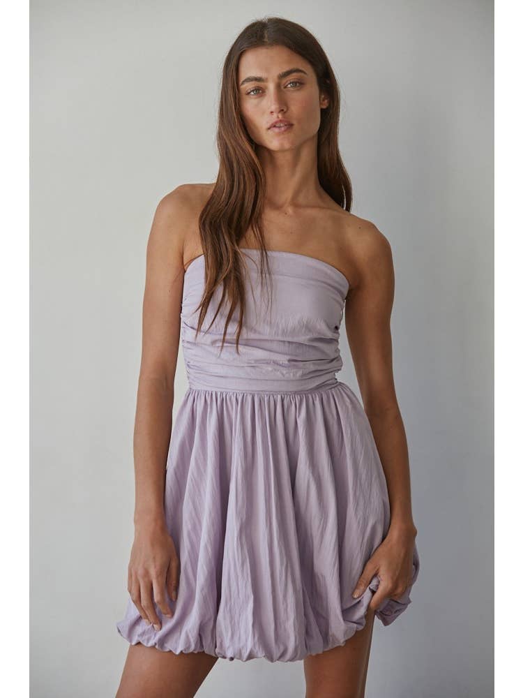 Float through your day in the ethereal charm of the Cloud Nine Bubble Dress — a dreamy, strapless mini designed to make you feel weightless and effortlessly styled. Crafted from soft, lightweight fabric in a romantic muted lavender, this dress features a ruched, fitted bodice that hugs in all the right places, and a voluminous bubble hem that adds a playful, sculptural silhouette.