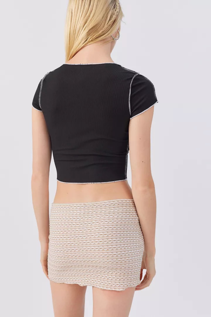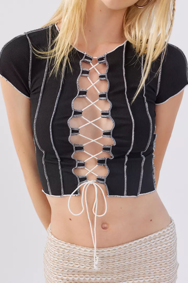 Turn heads and make a statement in the Cross My Heart Lace-Up Crop Top — - The Bombshell- the ultimate mix of flirty and edgy. Designed in soft ribbed knit fabric with contrast white stitching and a daring lace-up front, this top flatters every figure while keeping your look cool and confident. Pair it with low-rise jeans for a Y2K vibe or dress it up with a sleek mini skirt for a night out.