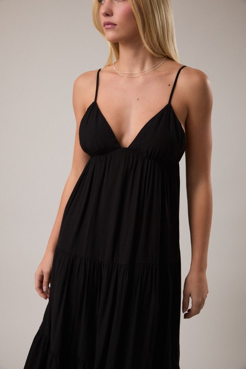 Its timeless black hue makes it endlessly versatile—pair it with ballet flats for a casual daytime look, sandals for vacation strolls, or dress it up with heels and layered jewelry for an evening out. Comfortable, breathable, and effortlessly chic, this tiered midi dress is the kind of piece you’ll reach for all season long.
