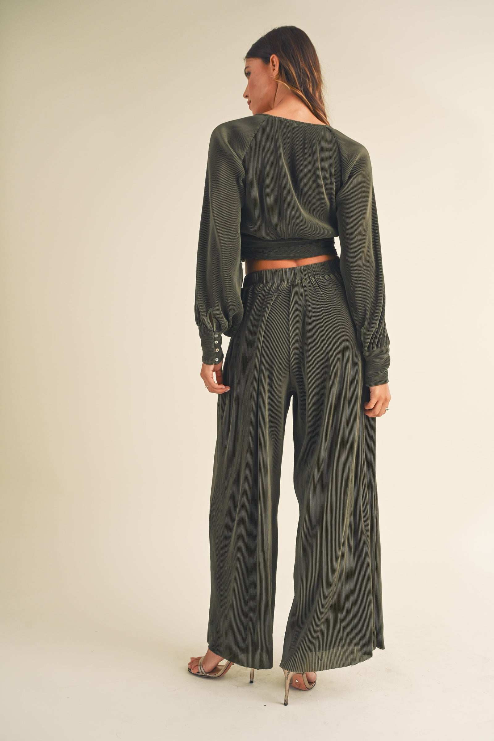 Long sleeve solid pleated fabric front twisted crop top and matching wide leg elastic waistband pants set. Lining.