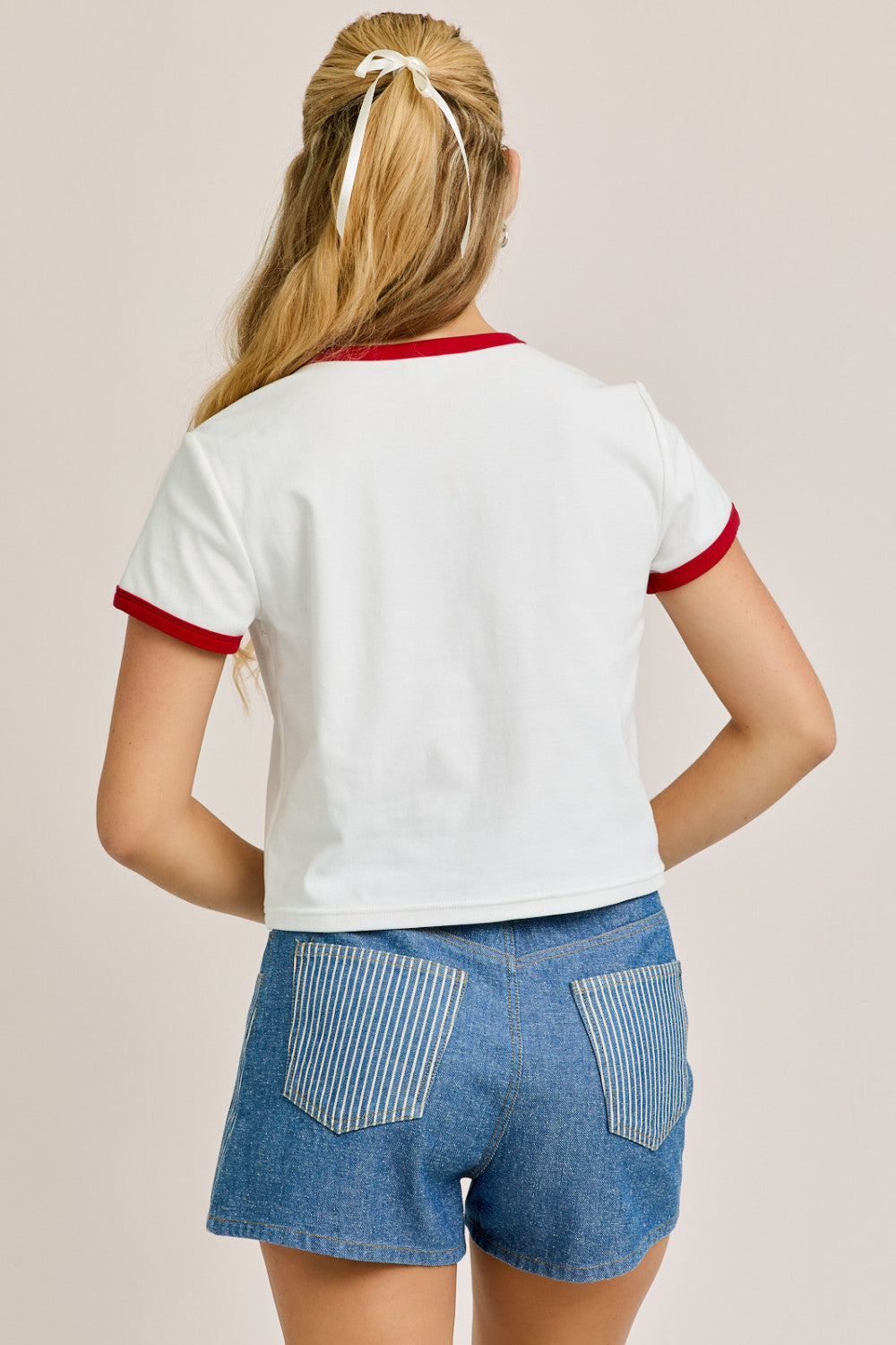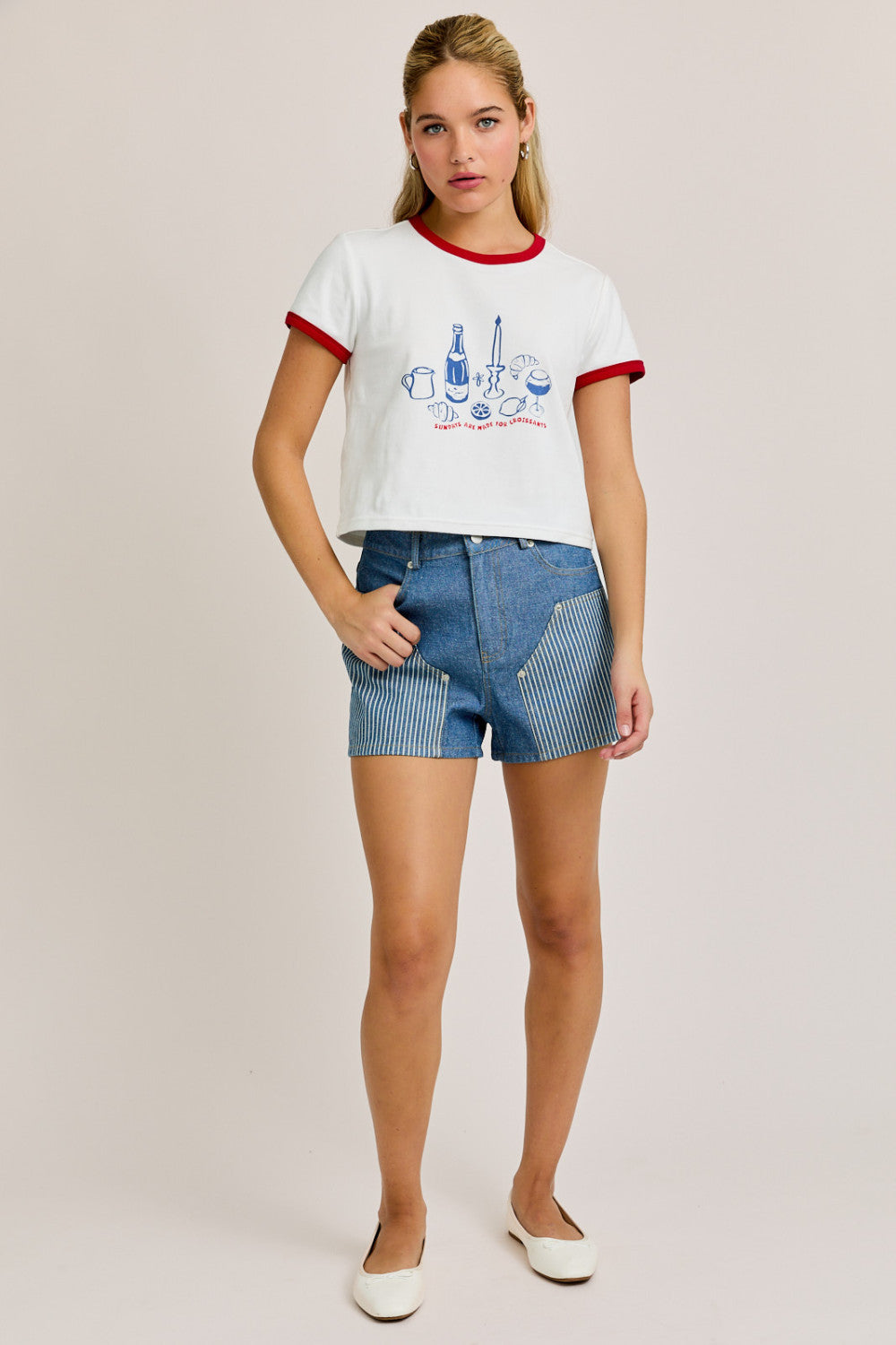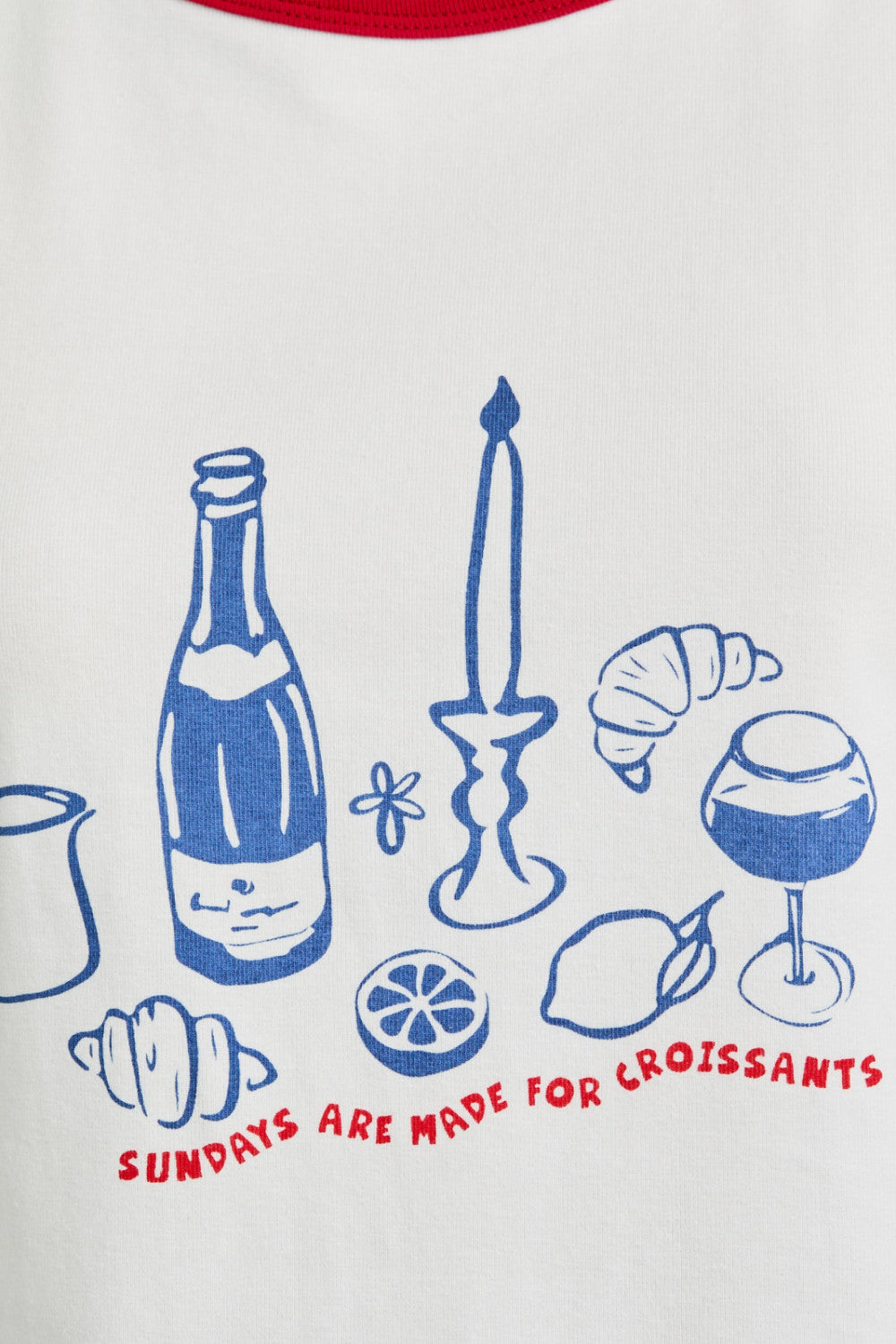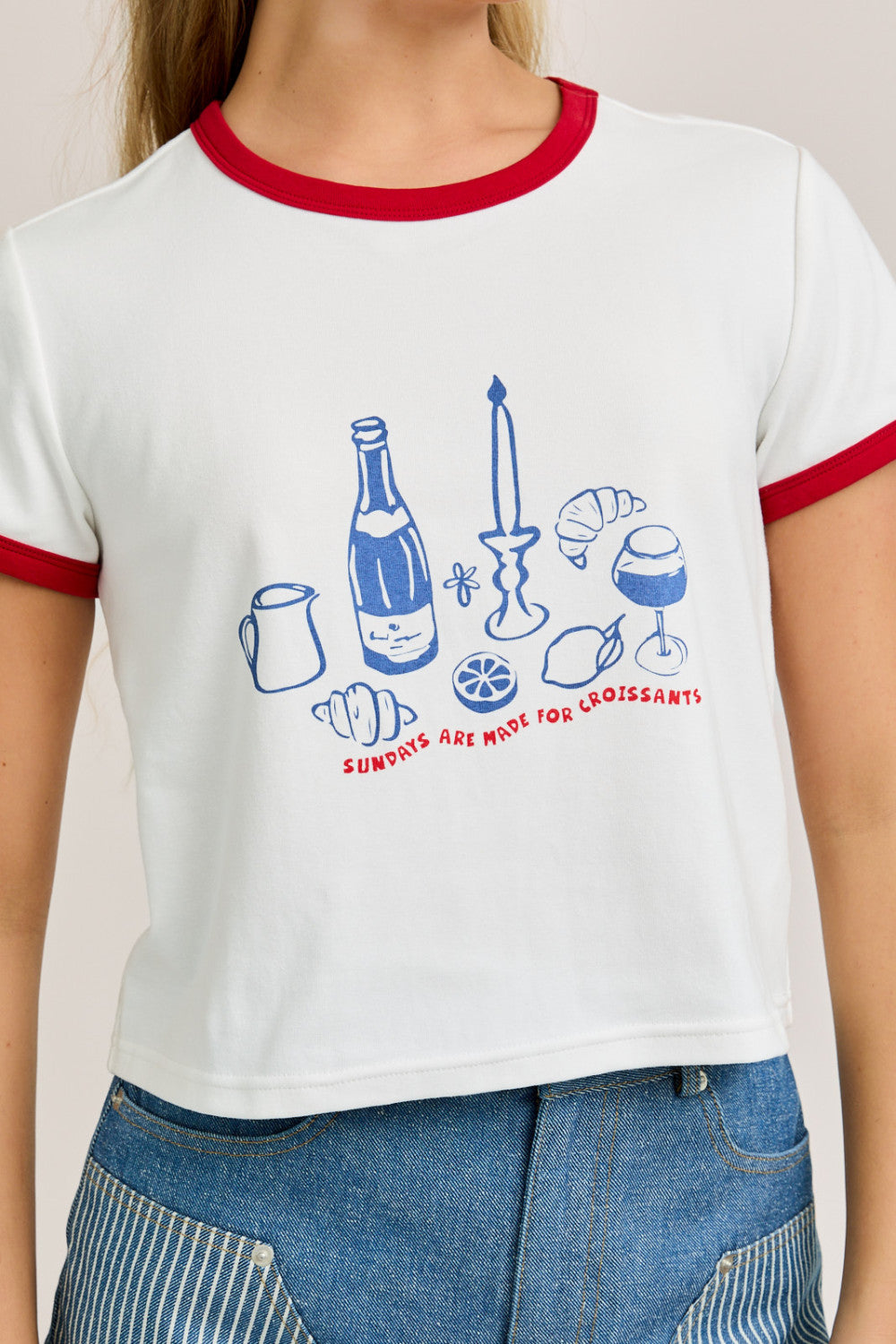 Start your day with style and a smile in our Pastry Princess Baby Ringer Tee. This playful white crop top features bold red contrast trim on the sleeves and neckline for a classic retro vibe. The charming front graphic celebrates brunch essentials — from croissants to coffee — with a cheeky "Sundays Are Made for Croissants" slogan that says it all.