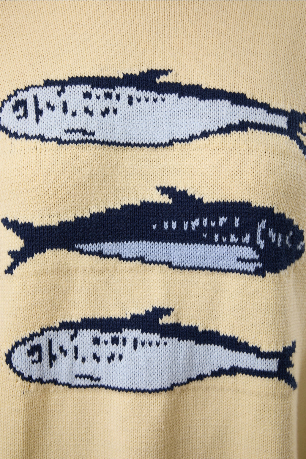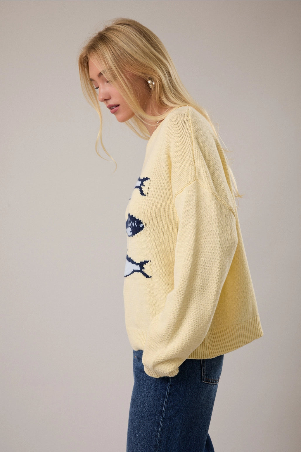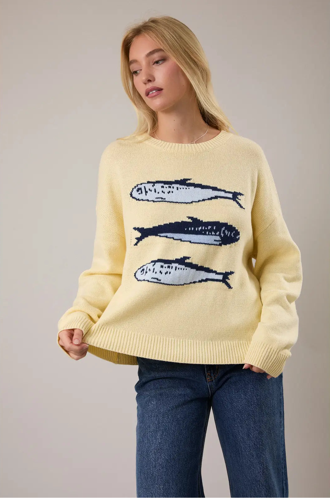 Bring a little coastal charm to your everyday wardrobe with the Sardine Dreams Knit Sweater. This soft butter-yellow sweater features a playful trio of sardine fish knit across the front, giving it that effortlessly cool, fun vibe we love. Equal parts quirky and cozy, it’s the kind of statement sweater that feels intentional and fun.