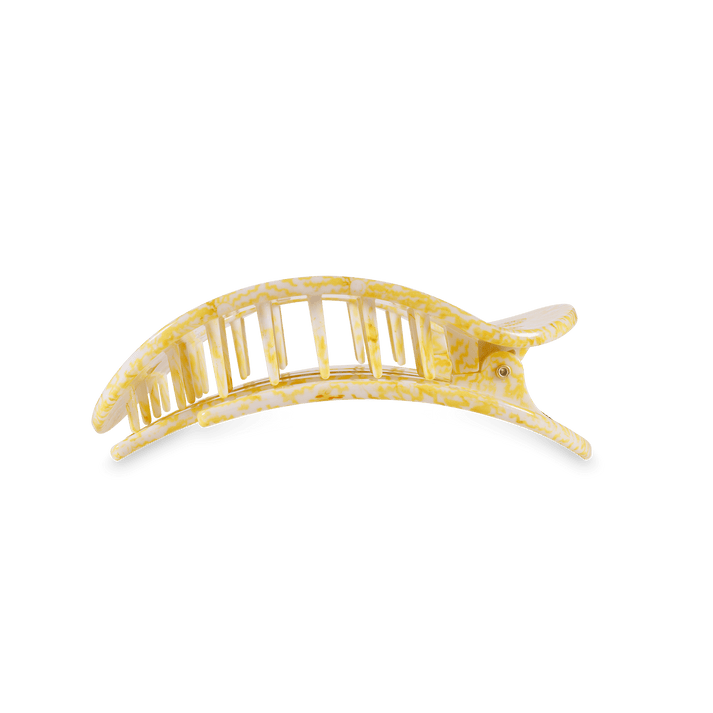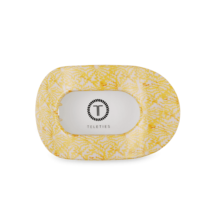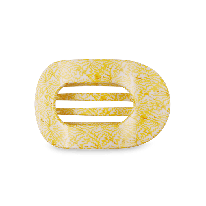 Lay flat and relax with the new TELETIES Yellow Fun in the Sun Medium Flat Round Hair Clip. This hair clip is designed to allow you to lay back flat, do yoga, or sit comfortably in a seat with a headrest, and it is made with the same material that is nearly unbreakable.