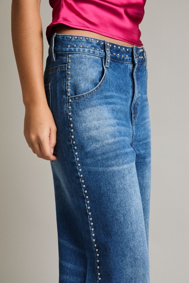 If early-2000s pop princesses, mall-rat icons, and MySpace sparkle graphics had a denim baby, it would be the Tell Me About It, Studded Wide-Leg Jeans. These are the jeans you wear when you want everyone to know you absolutely understood the assignment — studs, attitude, and that perfect wide-leg slouch.