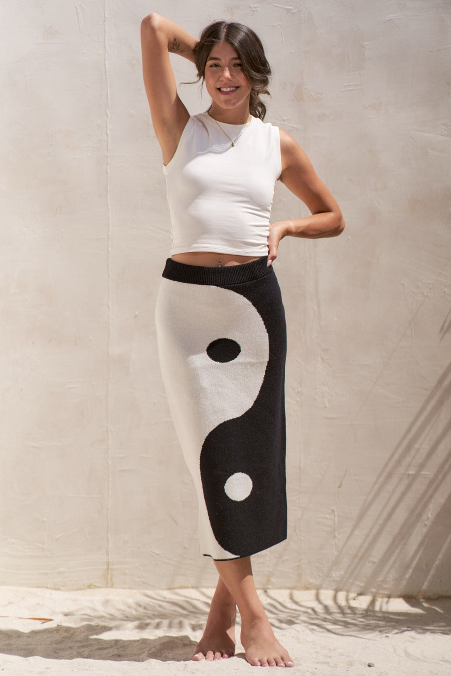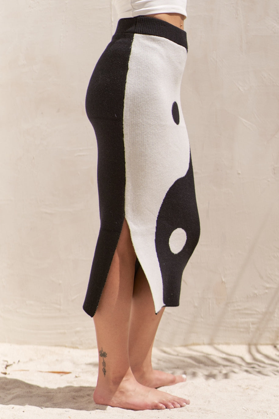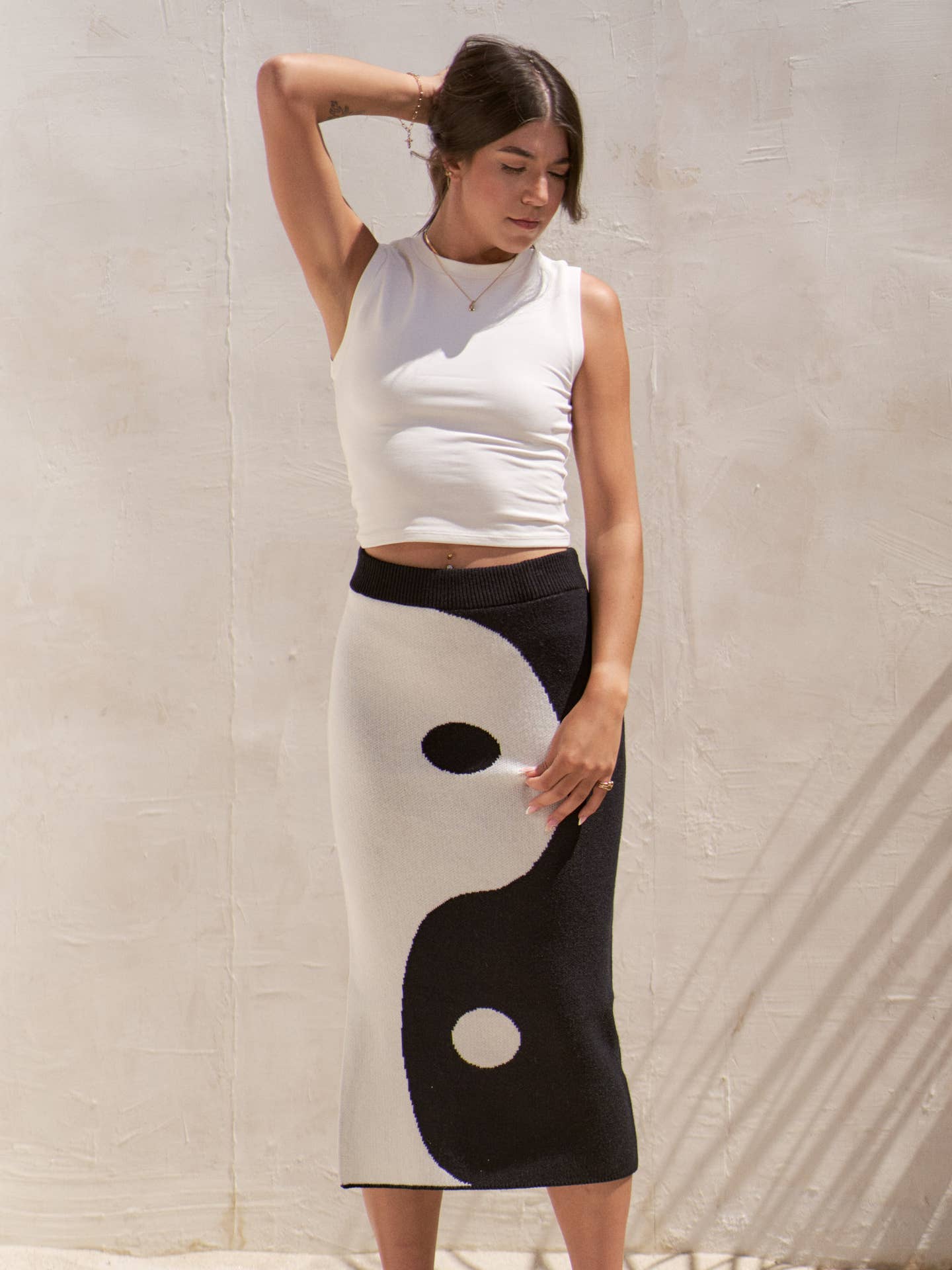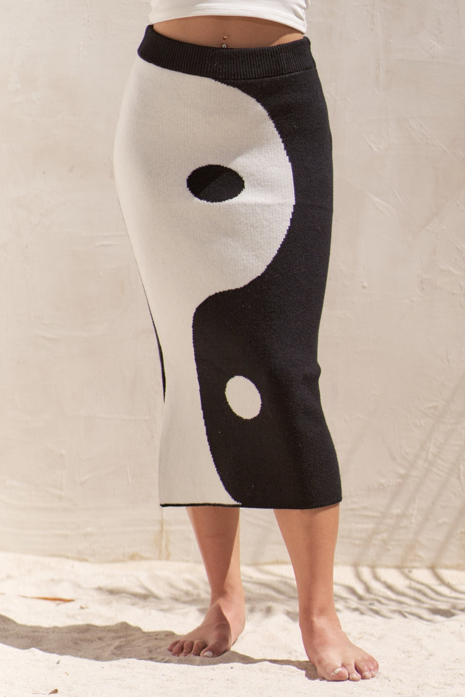 gFind your balance in bold minimalism with the Yin & Now Knit Midi — a soft, body-skimming knit skirt that brings together comfort, contrast, and effortless cool. Designed in a striking black-and-white yin-yang pattern, this statement midi embodies everything modern femininity stands for: harmony, strength, and style that flows between day and night with ease.
